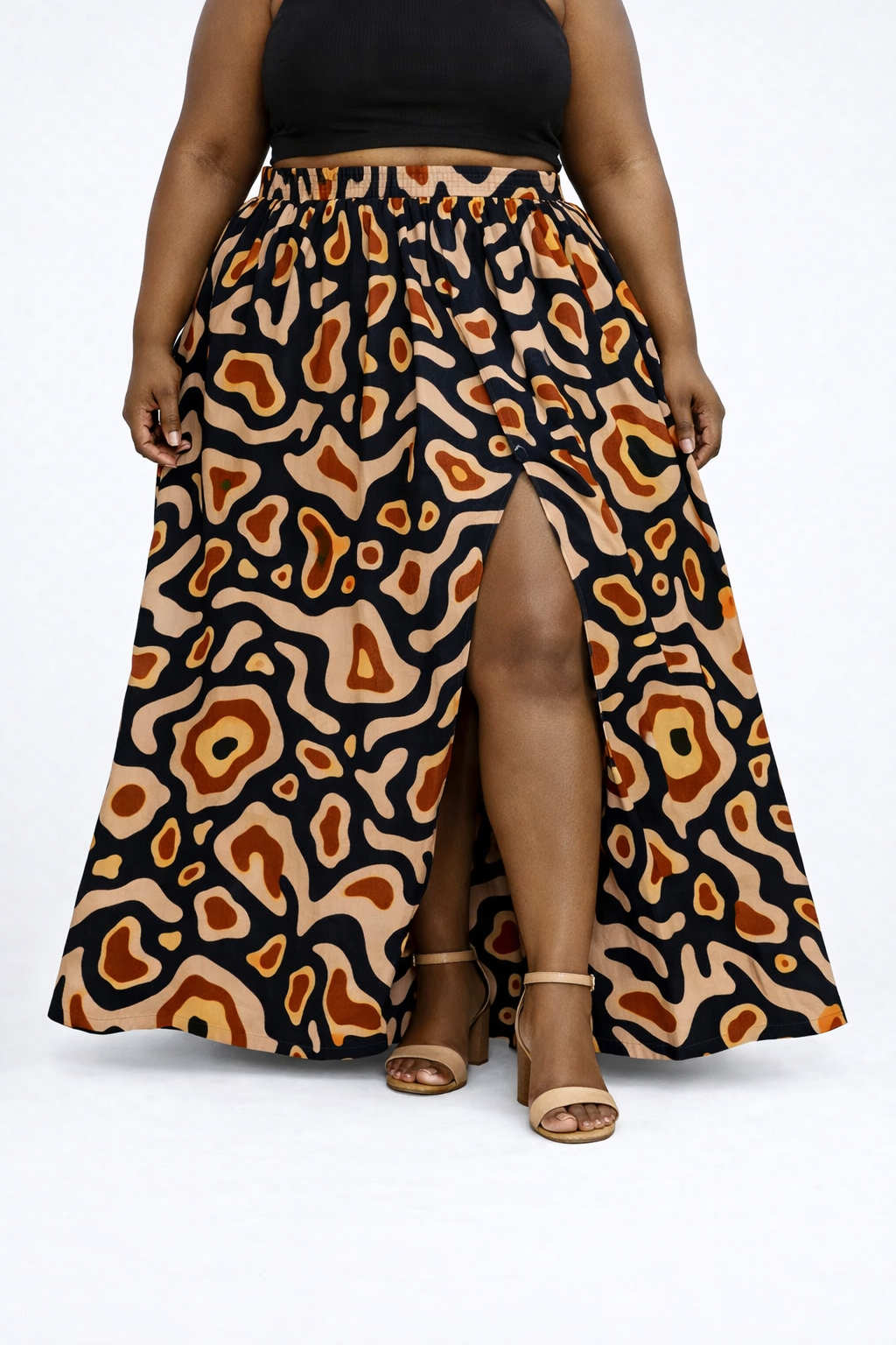 Our Wura split gathered skirt Features an organic abstract pattern with free‑flowing shapes in earthy brown and orange tones, creating a bold, natural look.